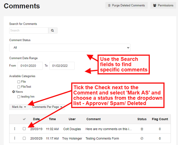 Admins can use this area to moderate site comments