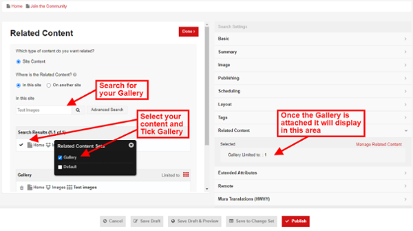 - Search for your Gallery, select your Content, Tick your Gallery and Publish